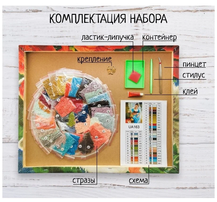 В набор входит и холст, со специальной клейкой основой также к нему может прилагаться специальная, пронумерованная, цветная инструкция со схемой рисунка, пинцет.