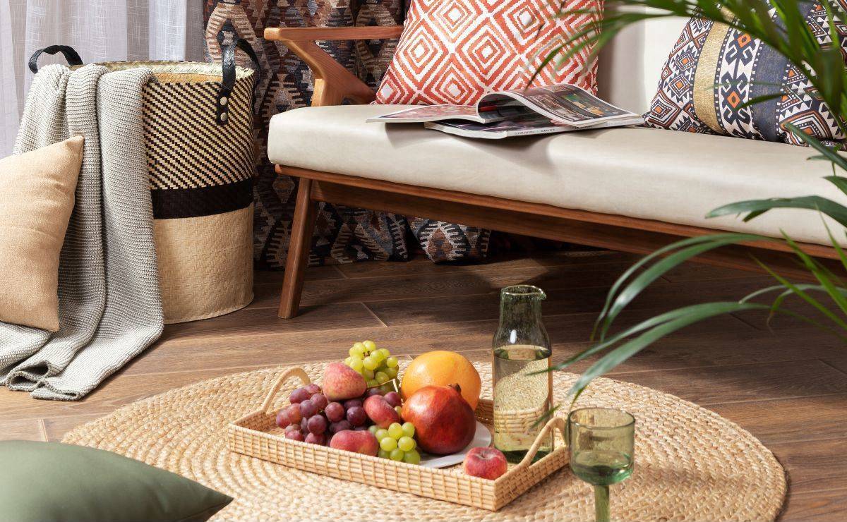 Здесь важен материал. Для изготовления ковров в этом направлении используются как натуральные джут, шерсть, хлопок, шелк, так и вторичное сырье – к примеру, переработанный пластик. При этом изделия с применением вторичного сырья – не просто символ ответственного отношения к природе. Это неплохая инвестиция, ведь такие ковры долговечнее своих «натуральных» собратьев.