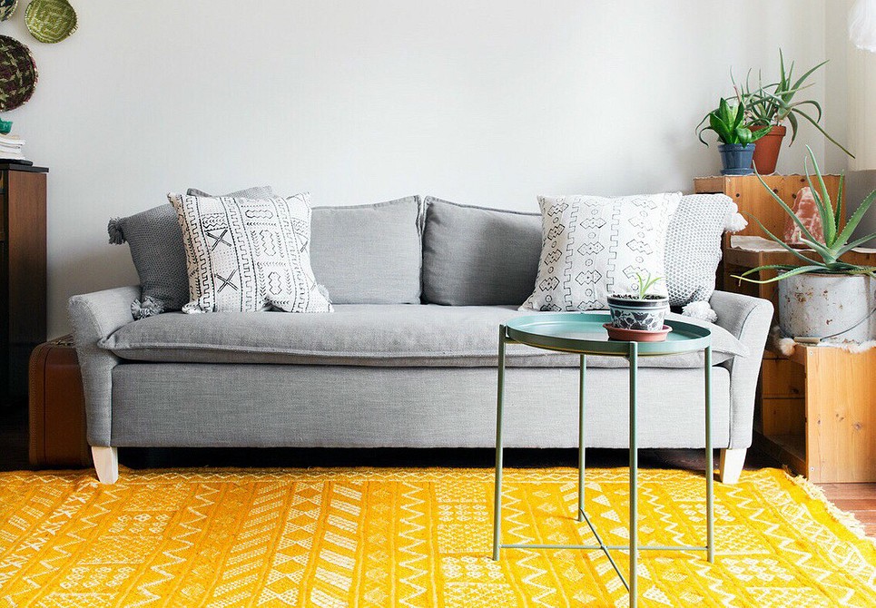Размер может быть сложным. Вам не нужен такой большой ковер, чтобы он касался стен, но вам также не нужен ковер настолько маленький, что он прячется под журнальным столиком. В зависимости от пространства, вы можете пойти разными путями. Для гостиных обычно требуется что-то большее; что-то, что объединяет каждый предмет мебели. Если вы не можете позволить себе большой старинный ковер, вот тут-то и пригодится многослойность. Я большой сторонник покупки сизалевого ковра размером с площадь, а затем слоя антикварного ковра меньшего размера поверх него. Это работает как шарм и очень в тренде.