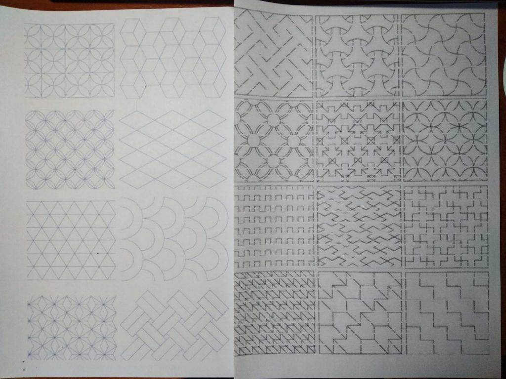 После чего заполняю узором пространство внутри этих фигур. Сам узор сашико выделяйте более толстыми линиями или контрастным цветом чернил, чтобы не спутать с разметочной сеткой.
