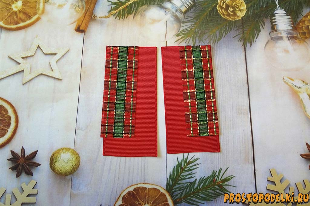 Тесемки нарезаются полосами длиной 20 см. В итоге должно получиться две детали одного цвета и столько же другого.