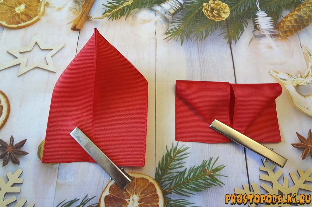 Элементы складываются пополам, а их края разводятся в противоположные стороны. За счет этого формируется прямой угол. После этого нужно соединить их вместе и сдвинуть тесемочки до края нижней части.