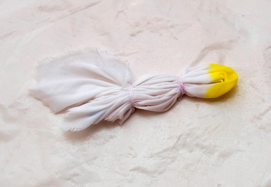 - Желтую краску разведите в воде в емкости. Опустите сюда ткань.