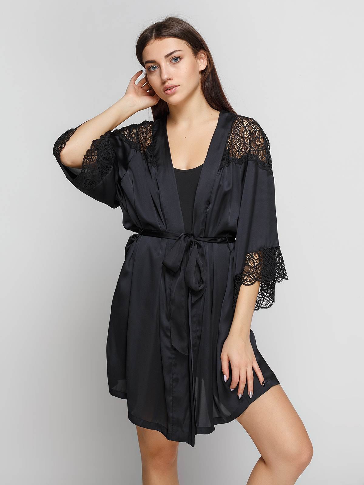 - Кимоно. Подходит больше данный халат для сборов невесты. По крою очень напоминает кимоно с широкими рукавами и свободным кроем. Чаще всего встречаются халаты в пол, но бывают и до колена.