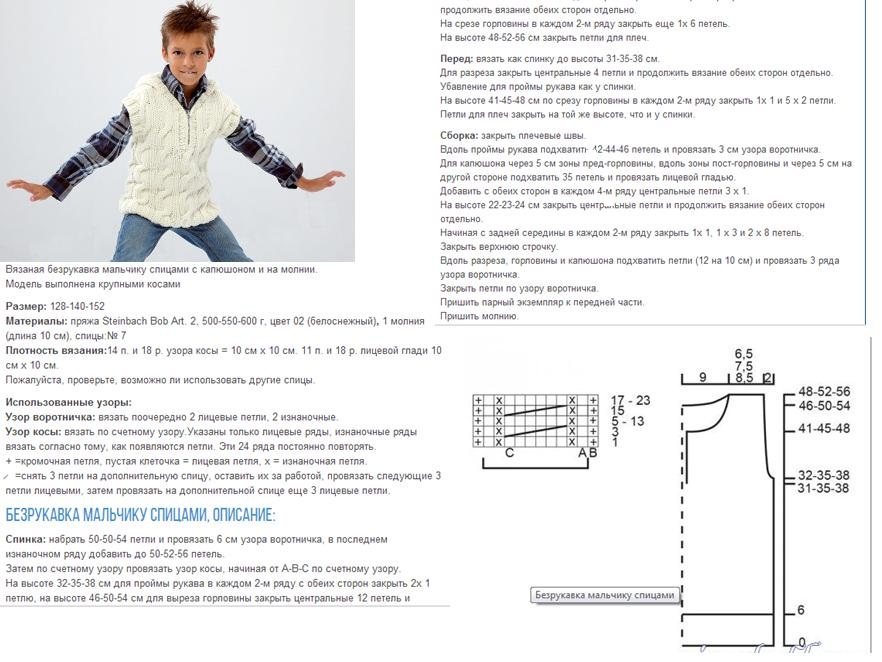Теплый жилет для мальчика 7-8 лет, декорирован косичкой и полосами платочной вязки. Рисунок хорошо просматривается в пряже светлых тонов. Схема простая, с ней справятся даже ранее никогда не вязавшие мамочки.