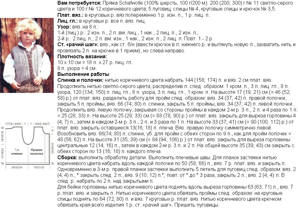 описание вязания серого жилета с пуговицами для мальчика спицами