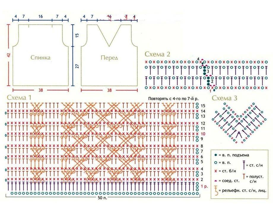Когда высота полотна достигнет пятнадцати сантиметров, измерьте изделие от центра подола. Для выполнения вставок проймы необходимо выполнить следующим образом: семь звеньев планки, 23 п по схеме, 16 п канавки, снова 54 п по узору, 16 п платочной вязкой, 23 п узором и 7 п полоски.