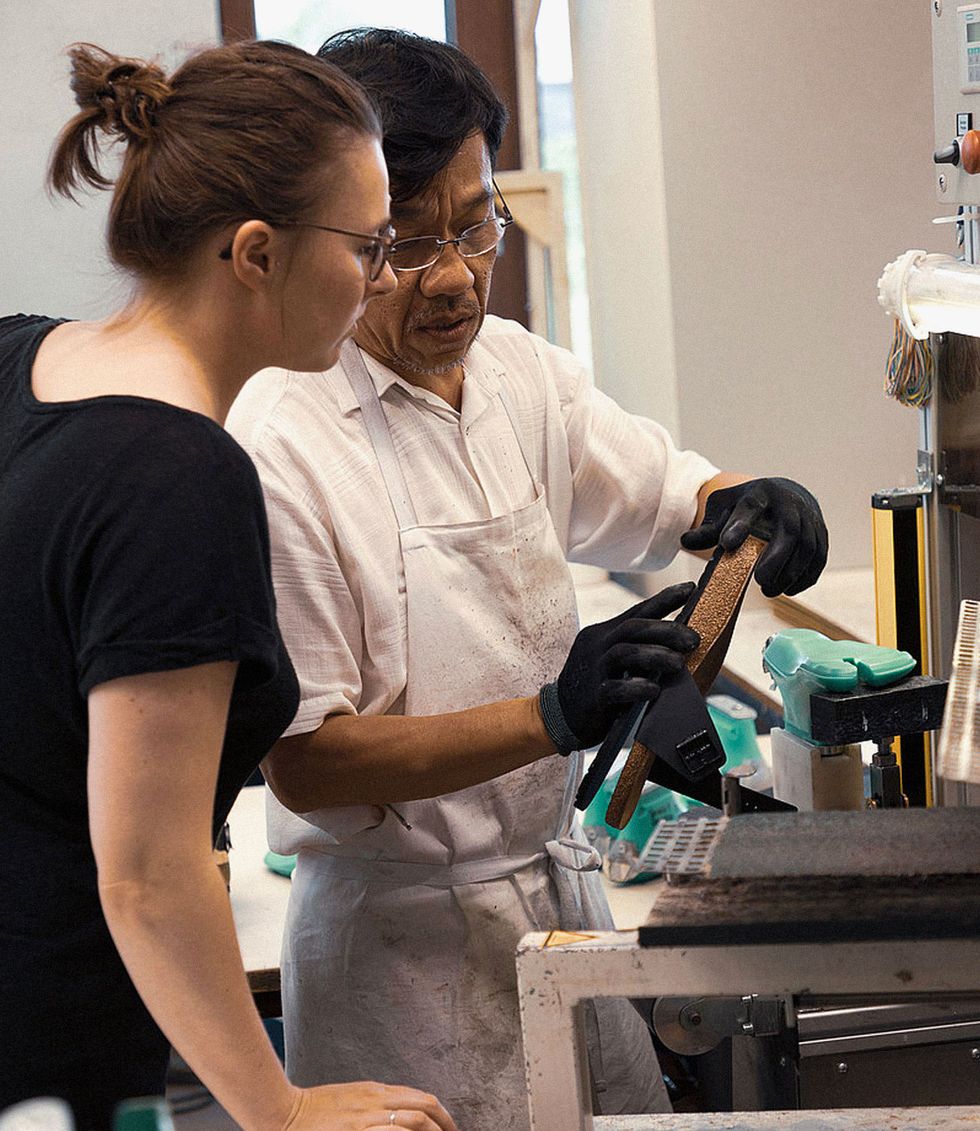 Стелька состоит из четырех частей. Основная часть стельки — это ее сердцевина. Она изготовлена из смеси пробки и латекса, который является гибким и амортизирующим. Затем сердечник стельки зажат между двумя слоями натуральной джутовой ткани, которая стабилизирует сердечник, позволяя ему изгибаться. Последний слой — замшевая подкладка. Она мягкая на ощупь и хорошо впитывает влагу, обеспечивая значительный контроль запаха.