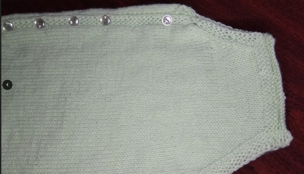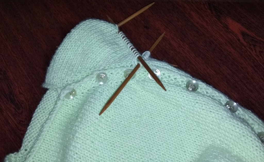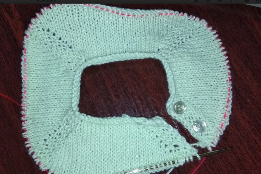 По правому краю (планка) не забывайте делать отверстия для пуговиц на равном расстоянии друг от друга. Если все же забыли, не беда. Такое частенько бывает, когда засмотришься на любимый сериал и вяжешь, не глядя. В этом случае спасут маленькие кнопки.