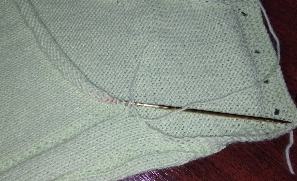 - На правой и левой полочке продолжать выполнять планку по всей длине деталей платочной вязкой;