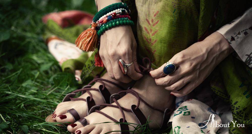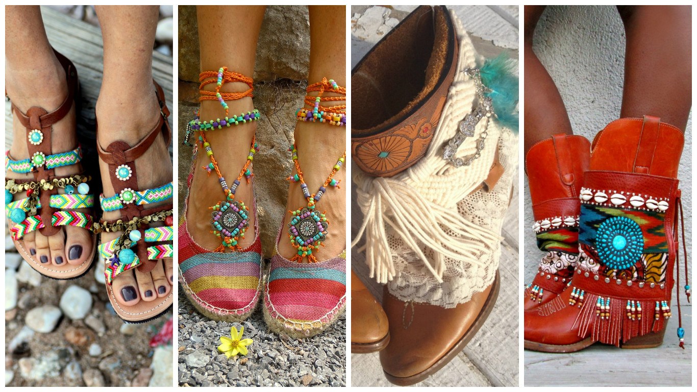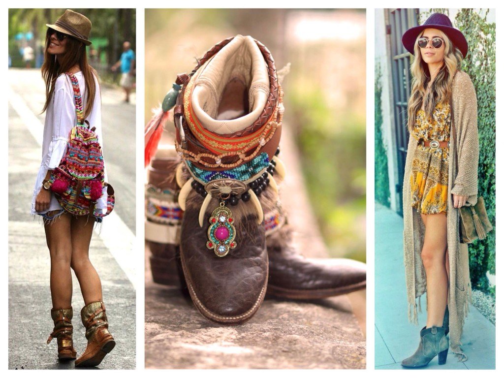 - Удобная обувь. Что касается обувки, отдавайте предпочтение простым моделям, сделанным из натуральной кожи. К образу подойдут: сандалии-«римлянки», ковбойские сапоги или казаки, «гладиаторы» с ремешками или легкие ботинки с бахромой. Берите модели на низком ходу, ведь стиль изначально предполагает комфорт.