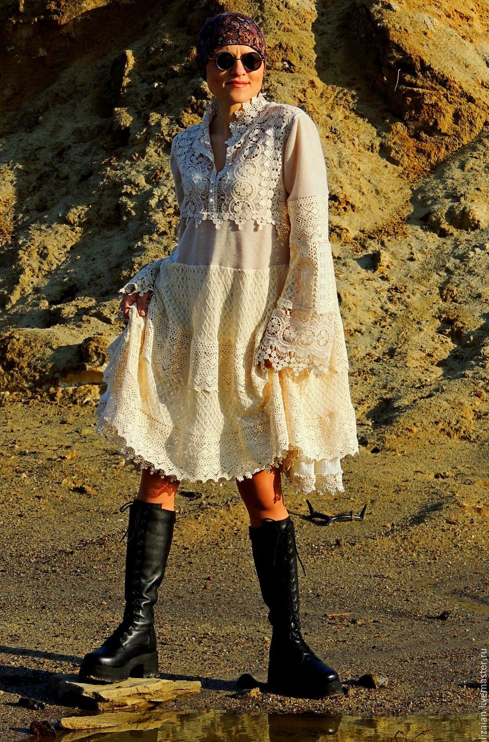 Вначале предлагаем модные платья в стиле бохо, что обязательно пригодится в этом сезоне. Посмотрите, например, на кружевное короткое платье белого цвета с треугольным вырезом и воздушными рукавами.