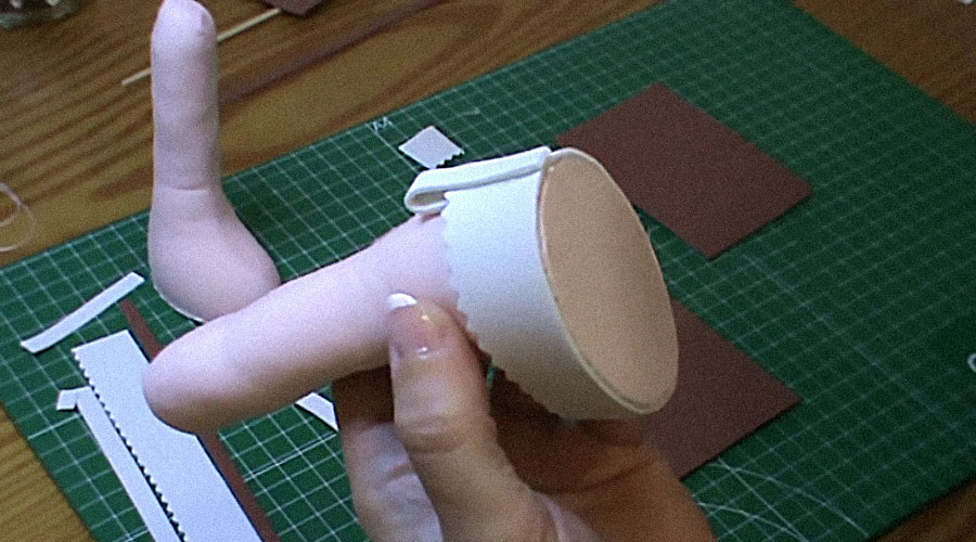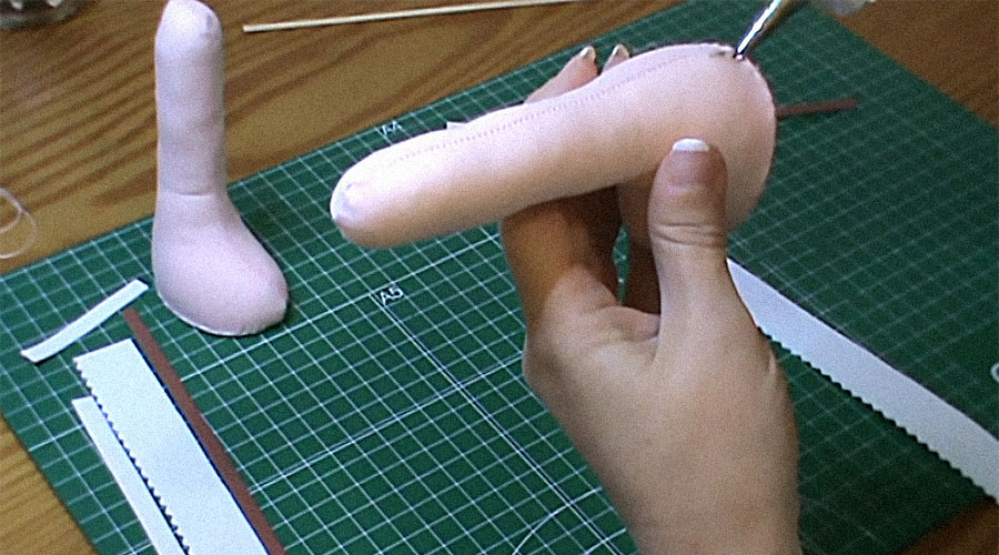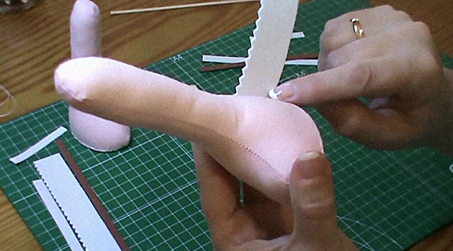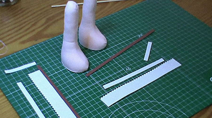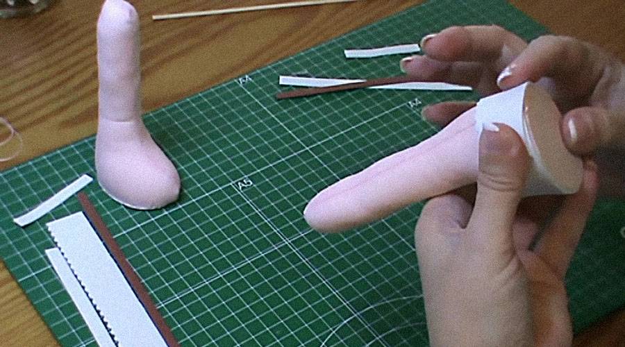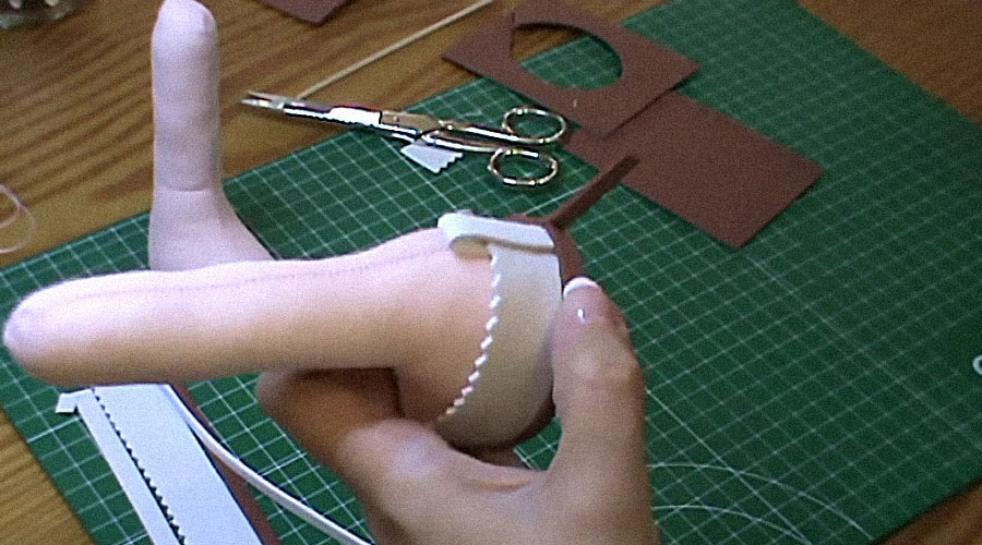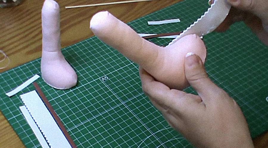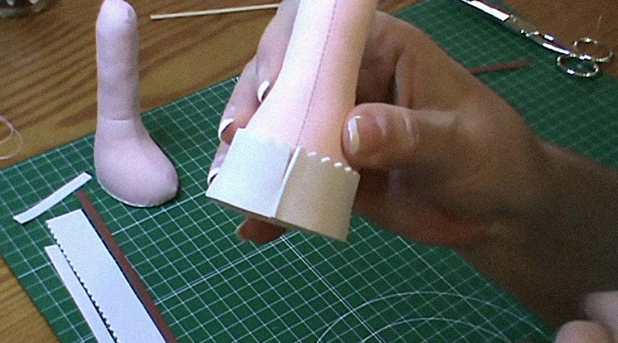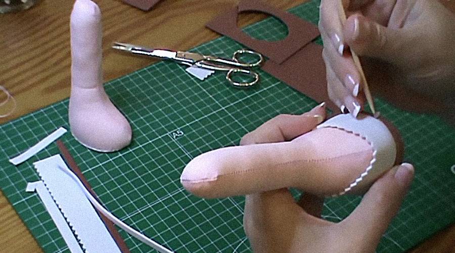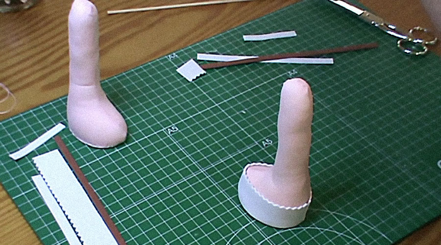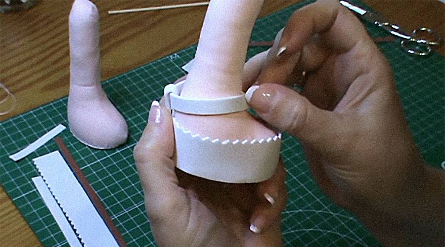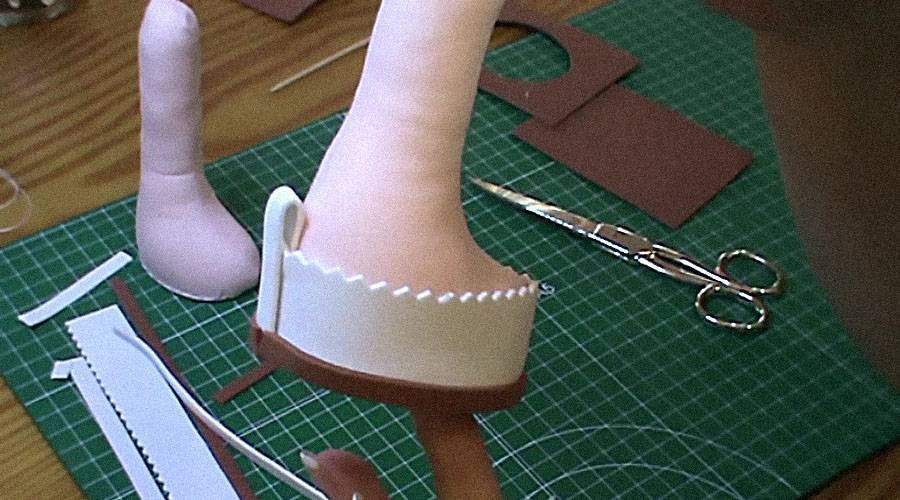 Для получения стельки стопу куклы обводят на плотном картоне, вырезают, переносят на ячеистый картон и тоже вырезают. Верх стельки изготавливают из ткани путем обведения выкройки стопы с припуском 5 мм.