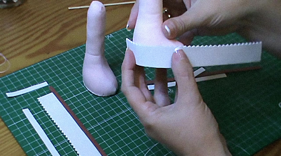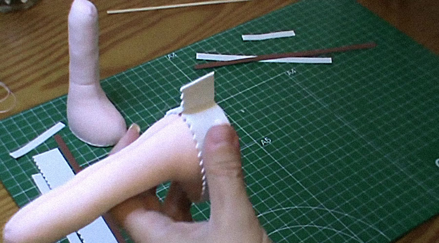 Полосу для застёжки вставляем в петлю. На ногу с внешней стороны наносим каплю клея и приклеиваем один конец полоски.