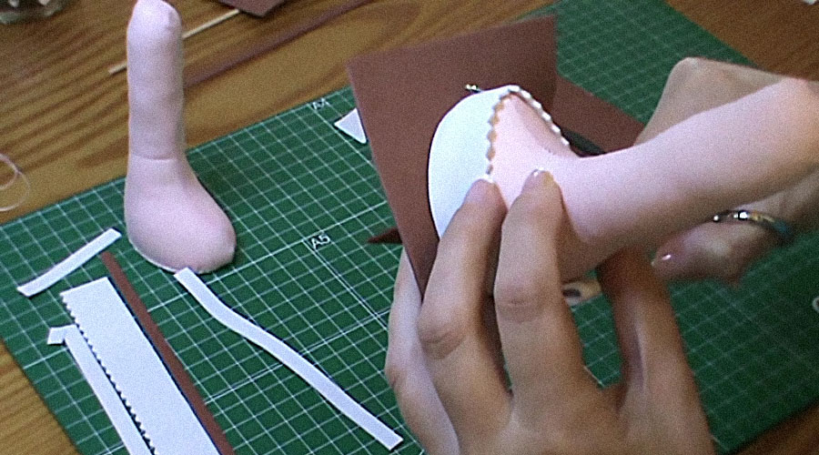 Подошву приклеивают к верхней части клеем «Момент», «Контакт» или термоклеем. При этом припуск мысочка из экокожи или фоамирана накладывают на подошву спереди и склеивают. Затем сзади и с боков, до мысочка, наклеивают полоску обрамления из экокожи, фактурированного фоамирана или бельевой резинки, закрывая подошву и шов.