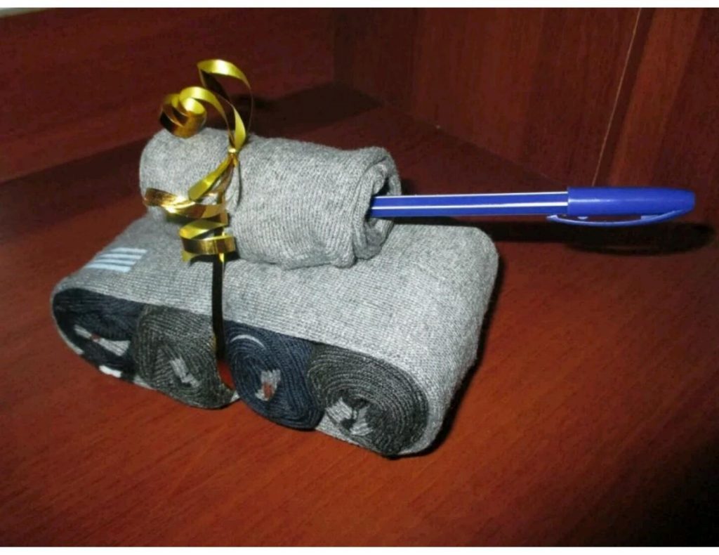 Мужской праздник – лучший повод порадовать своих защитников. Было бы неправильно оставить кого-то из знакомых мужчин без подарка в такой день, поэтому бюджет и необычные идеи подарков будут необходимы. В этом случае как нельзя лучше подойдут и носки. Многие умельцы сооружают из этого, казалось бы, банального изделия целые произведения искусства, которые обязательно понравятся мужчине.