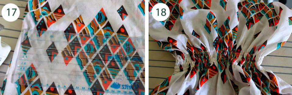 Для этого нужно срезать полоску ткани шириной 5 см. Подвернуть по 1 см по ширине, сметать и за утюжить. Пришить ее к изделию в области туники. Вставить резинку.