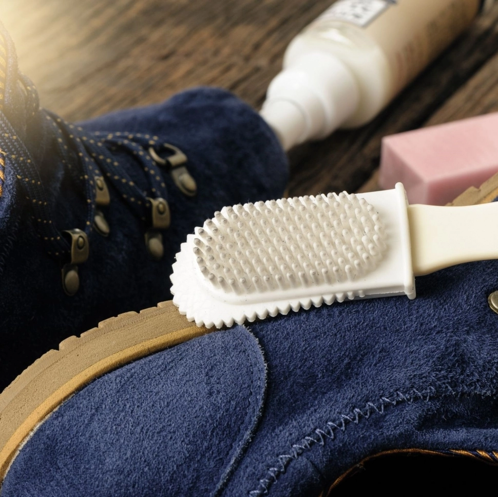 Не обойтись и без специальной щёточки с резиновыми щетинками. За счёт своего материала такая щётка не будет повреждать и царапать замшу, а очень бережно и аккуратно приведёт внешний вид обуви в порядок.