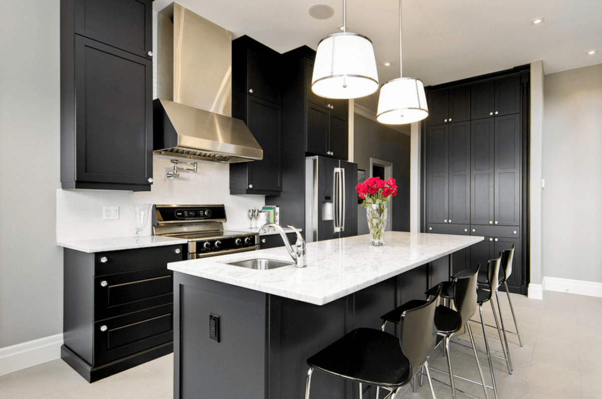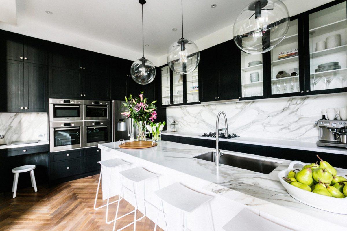 В просторной кухне чёрный и белый часто используют для разделения пространства на рабочую и обеденную зоны.
