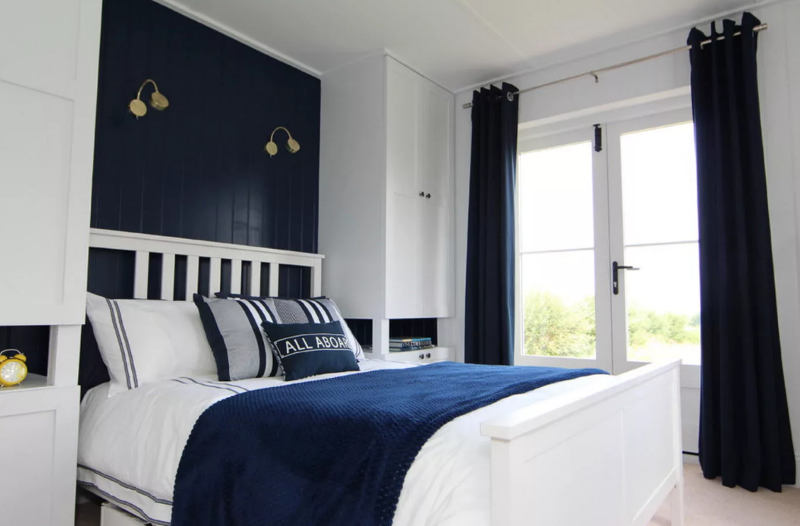 Смелое и свежее решение − тёмная акцентная стена в сочетании с белой мебелью.