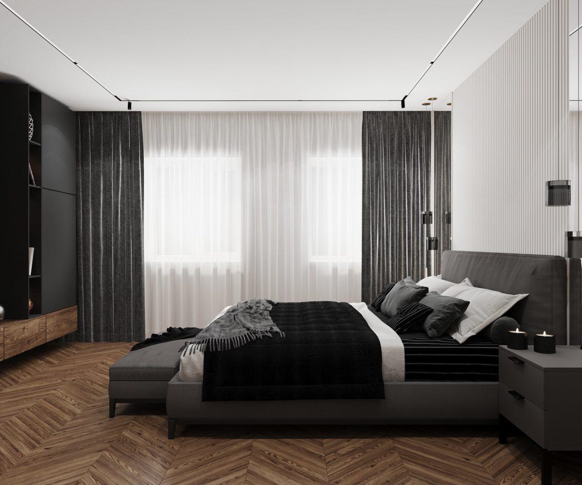 Сдержанный чёрно-белый дизайн в спальне поможет расслабиться после напряжённого дня. Строгую обстановку смягчит: