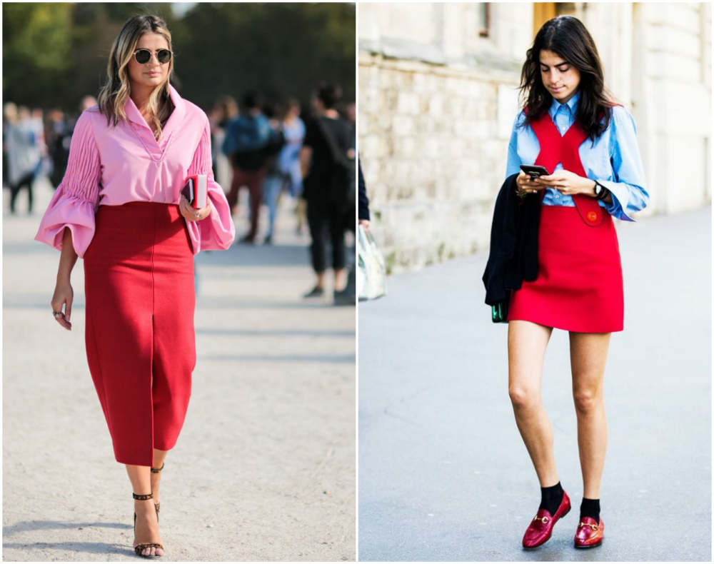 Все оттенки красного подойдут для любого предмета одежды: топа, юбки, платья, блузки, жакета. Самые смелые модницы смогут создать дерзкий ярко-красный тотал лук. Те, кому красный покажется слишком вызывающим, возможно выберут оранжевый и нежно-голубой цвет. В топе также розовые, жёлтые и зелёные тона.