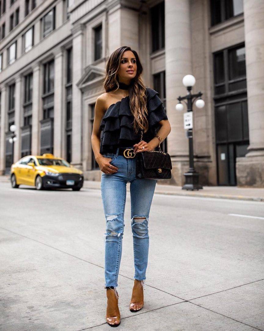 Джинсы с завышенной талией прекрасно будут смотреться как под майку с тонкими бретелями, асимметричными блузами, свитерами оверсайз, так и с коротким топом в дополнение к удлиненному кардигану.