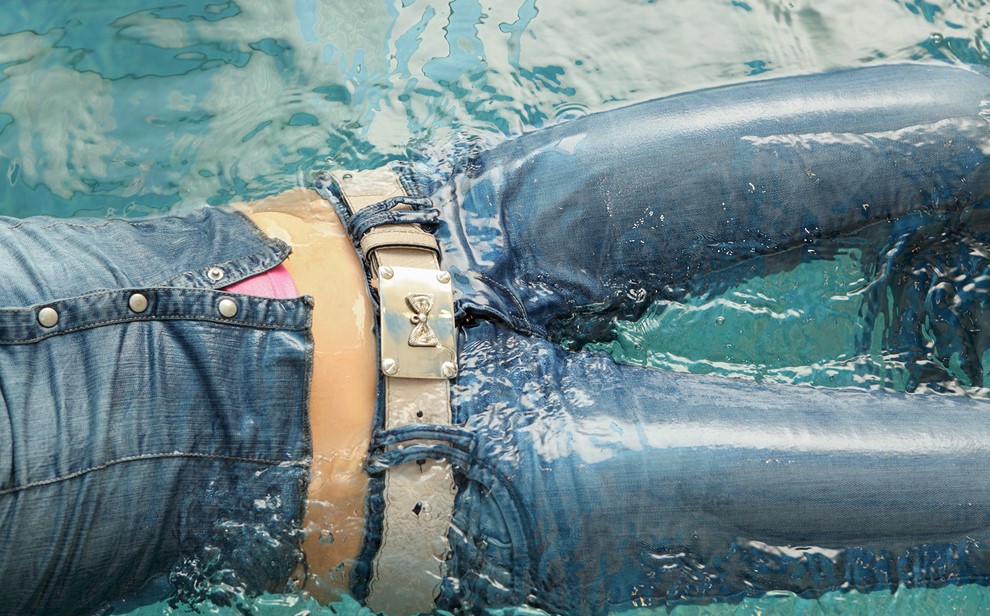 Чтобы джинсы сели идеально по фигуре, их следует постирать прямо на себе. Для этого нужно надеть брюки, набрать в ванну воды с температурой около 40 градусов, погрузиться в воду на 15 минут, а потом выйти и не снимать мокрую вещь, пока она не высохнет. После высыхания брюки приобретут идеальный размер. Правда, эффект сохранится лишь до следующей стирки.