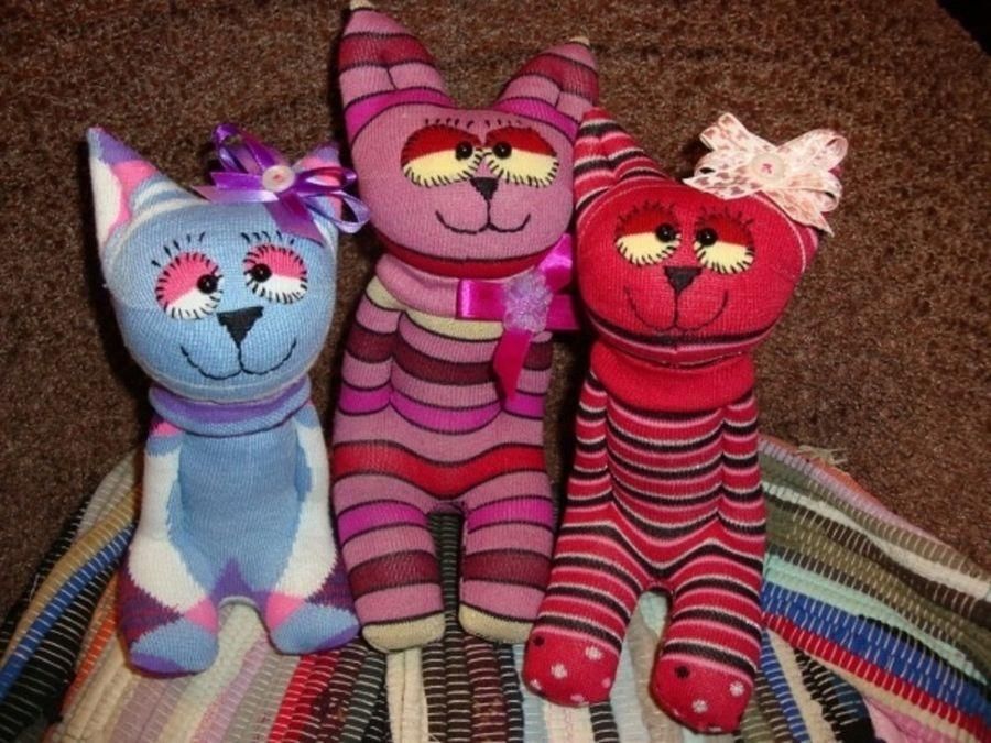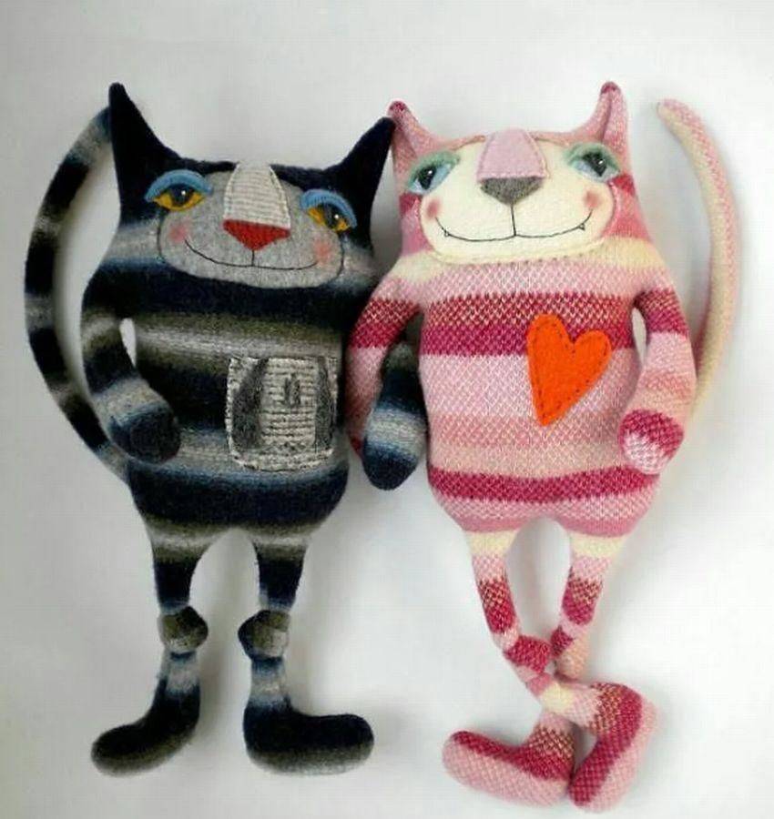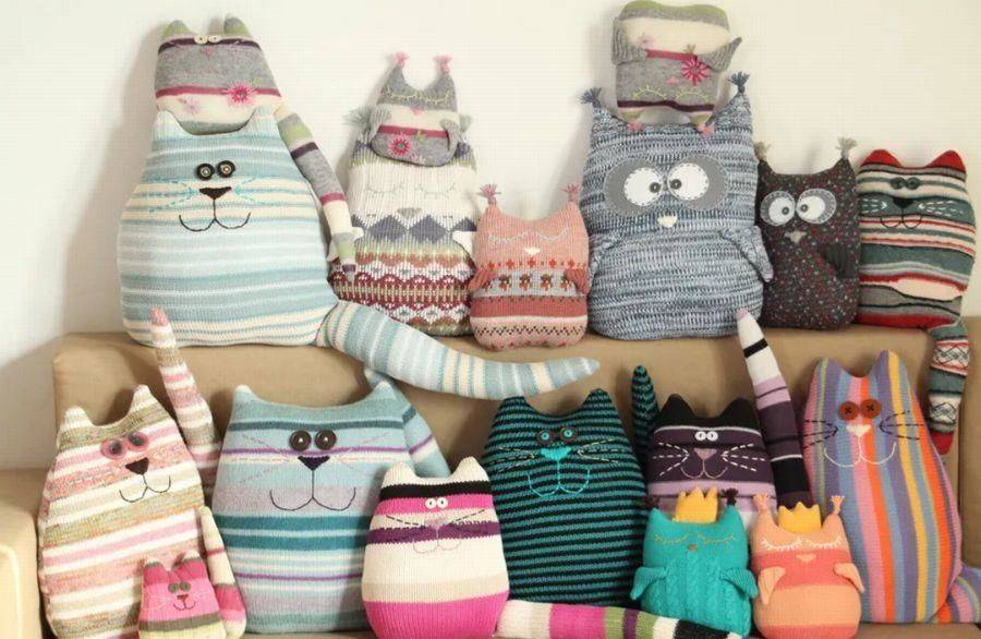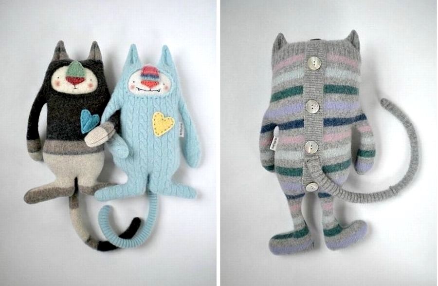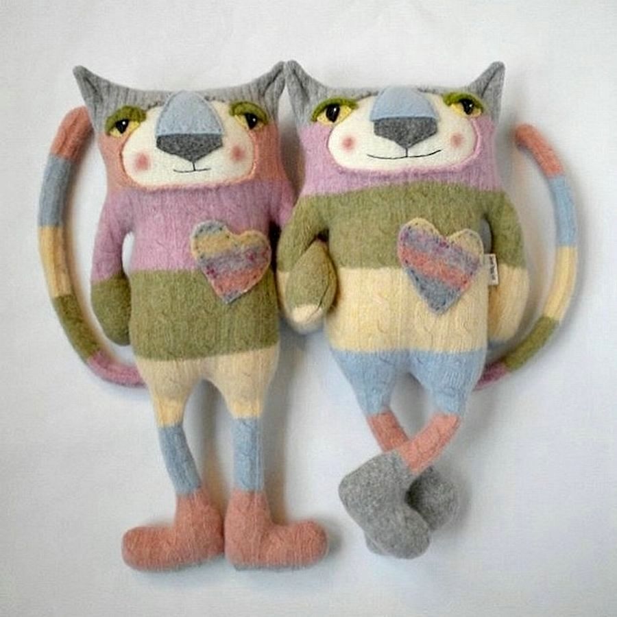 Игрушки, которые получатся у вас в итоге можно продекорировать различными материалами. Например, в качестве глазок или носика может подойти даже обычные пуговицы. Вот целая компания котов, кошек и кошечек из старых свитеров и джемперов, кроме шерстяных, есть и хлопчатобумажные, и синтетические.