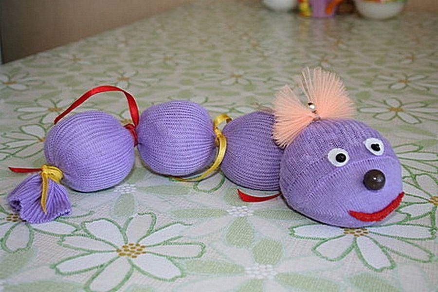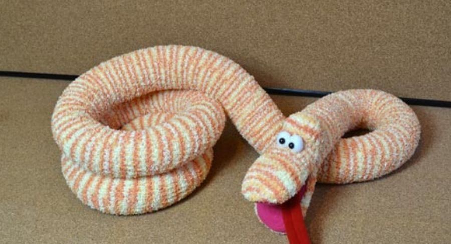 А такая игрушка в форме змейки не оставит равнодушным никого. Сделать её не составит труда, а в итоге получается то, что всегда будет радовать ребёнка.
