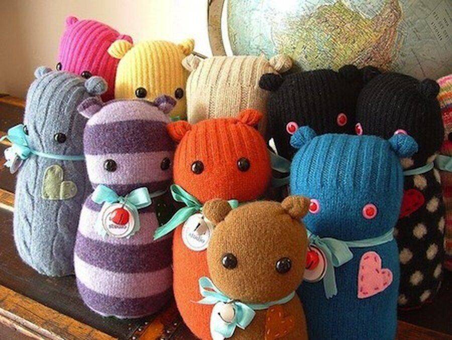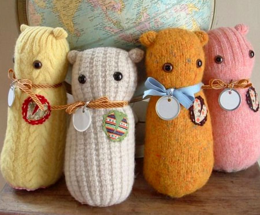 Мягкие игрушки из подручных материалов бывают очень симпатичные, милые, эксклюзивные и необычные. Потому что тот, что делал их своими руками, вкладывал в них частичку собственной личности, а личности творческих людей встречаются очень интересные. Свитер использовался, естественно старый, ненужный, лишний, надоевший, а вот мягкие игрушки из него получились новые и чудесные во всех отношениях.
