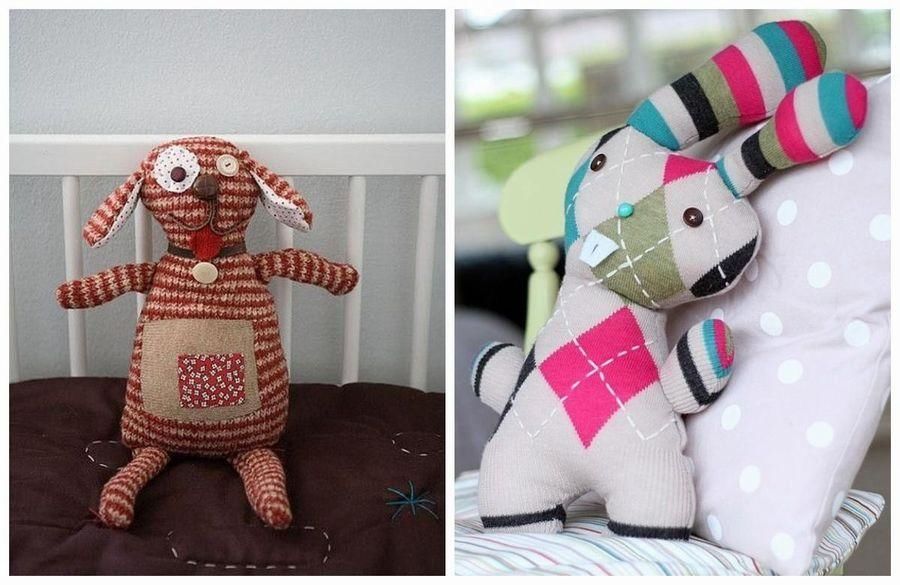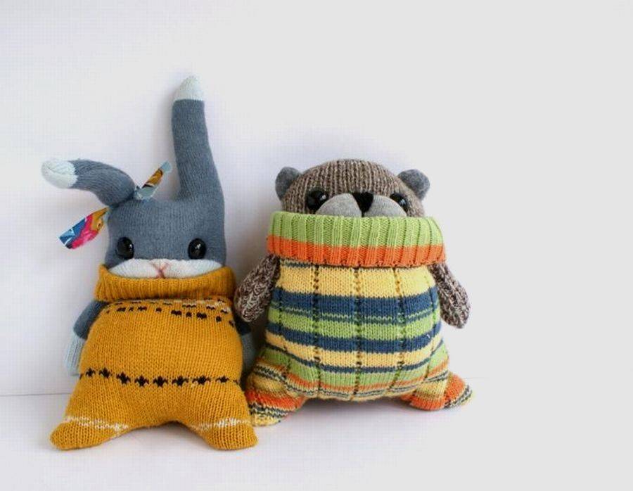 Игрушки из старых свитеров милые малыши зайка с медвежонком. Они сделаны из свитеров так, что кажется, сами одеты в свитера. Интересная техника у мастера.