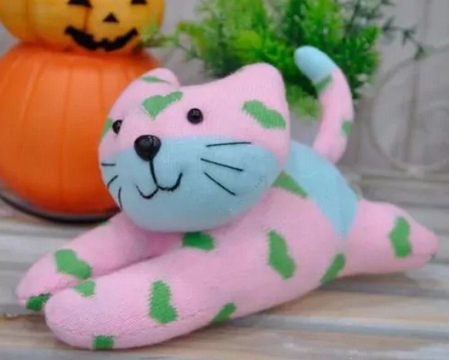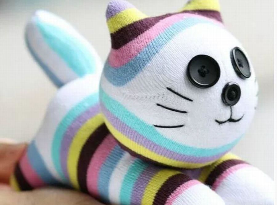 Из колготок также можно сделать забавную и интересную игрушку в виде такого полосатого котика. А пуговицы отлично подойдут для того, чтобы пришить их, изобразив глазки у нашего животного.