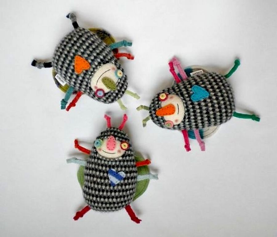 Набор небольших жуков около 30 см ростом каждый из старых свитеров. Мягкие игрушки могут послужить и декоративными подушечками для детской.