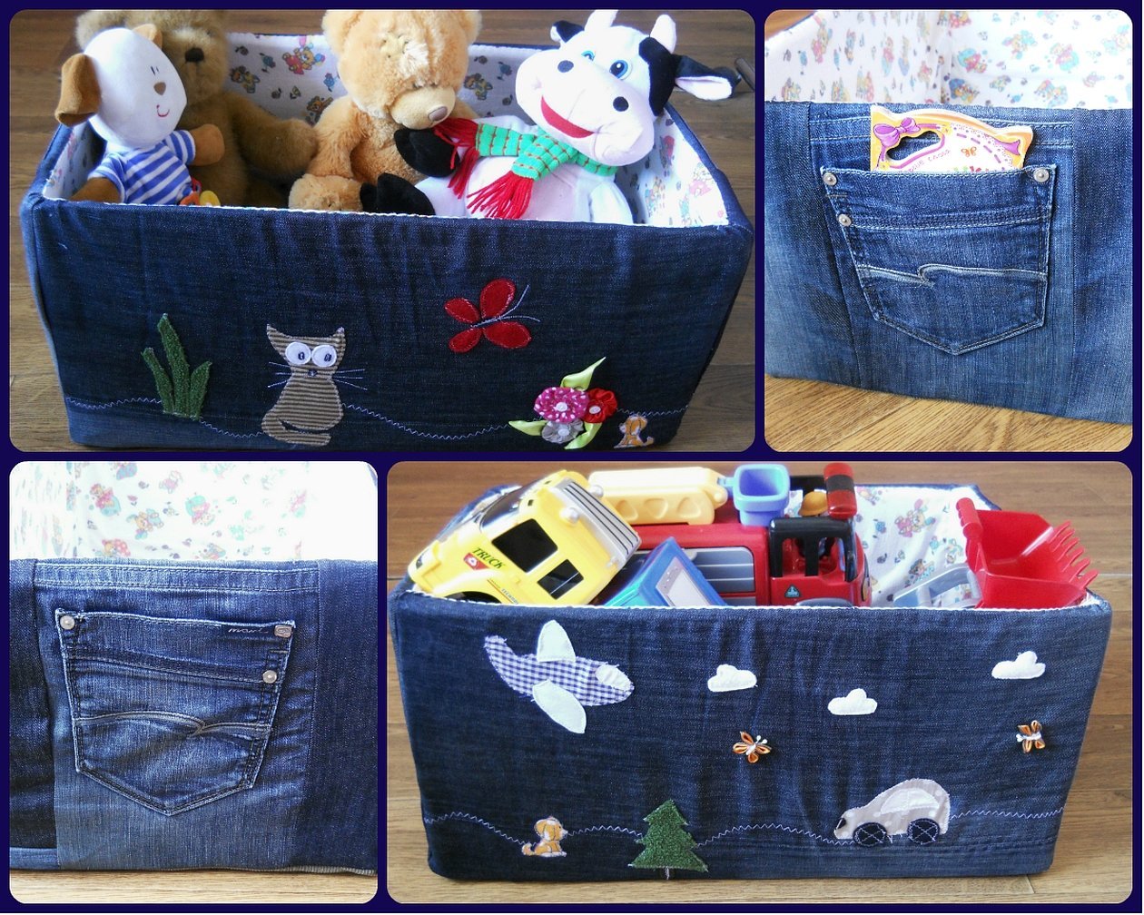 Полезной станет поделка, комбинированная из картонной коробки и джинсового полотна. Нужно снять мерки с коробки-основы и сделать лекало. С помощью клеевого пистолета приклеить текстильное полотно к картону. Произвести декорирование.