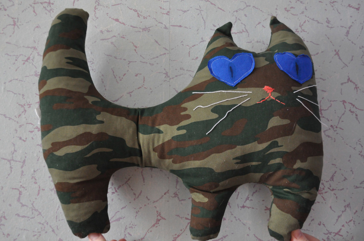 Шьется кот-подушка легко и быстро: по схеме выкраиваете на ткани детали кота нужного вам размера, сшиваете их, набиваете наполнителем и вышиваете глазки, носик и ротик. Необязательно делать кота полосатым. Можно сделать его пятнистым, однотонным или нашить на его спинку сердечки. В любом случае он получится очень обаятельным. С такой милой игрушкой можно не только играть, но и использовать ее в качестве подушки.