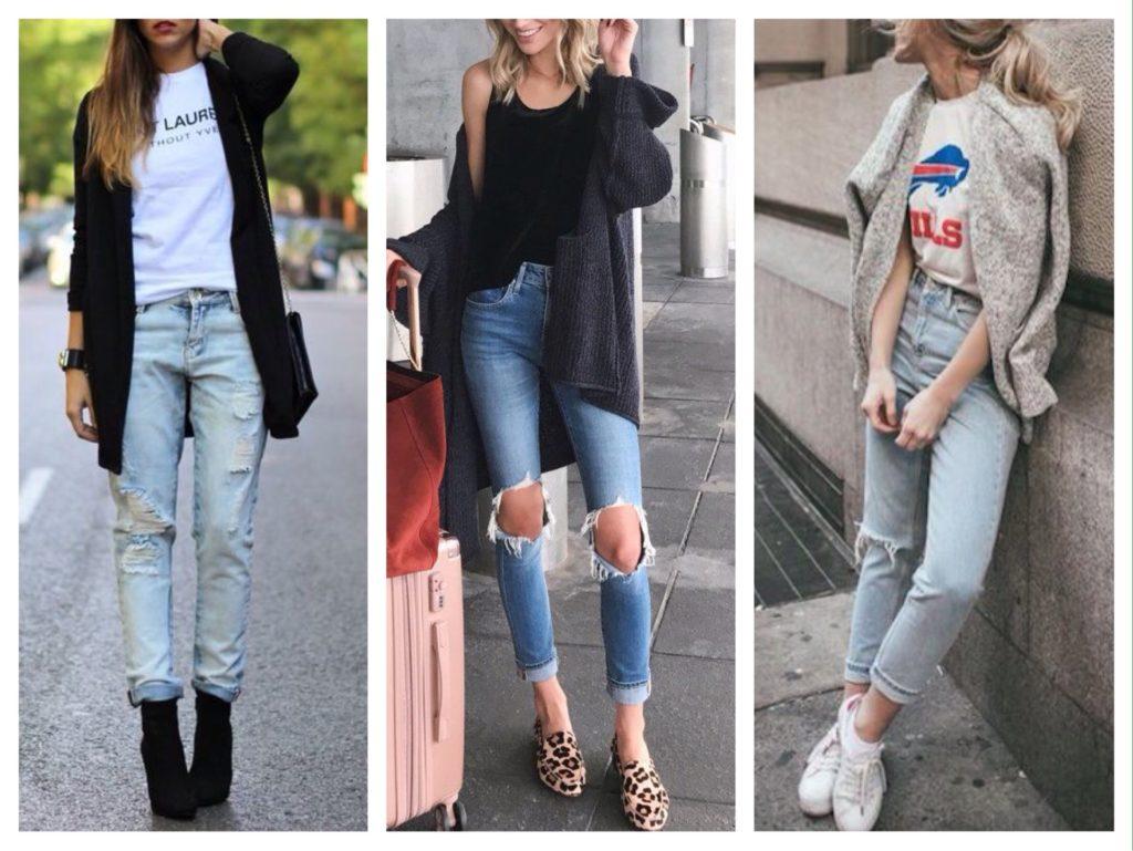 Смелые и уверенные в себе девушки выбирают рваные голубые джинсы. Верх в таком случае не должен быть чересчур перегружен декором, драпировками или другими украшениями. Оптимальный вариант футболка. Оригинально смотрится сочетание с элегантной белой блузкой или топом, что видно на фото. Дополнить комплект можно и пиджаком подходящего цвета.