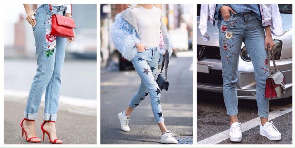 Отдельное место в сердцах многих девушек заняли джинсы с принтами, чаще всего это узкие модели. В таком случае верх обязательно должен быть однотонным и светлым, либо ограничиваться простым черным топом. Наиболее популярны голубые джинсы с цветочными принтами.