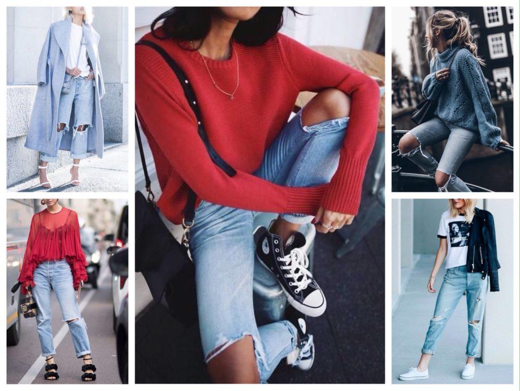 Носить рваные модели, как и другие голубые джинсы можно с самой разной обувью. Это могут быть и туфли на каблуке, и сандалии, и варианты в спортивном стиле. Аксессуары стоит подбирать не слишком массивные.