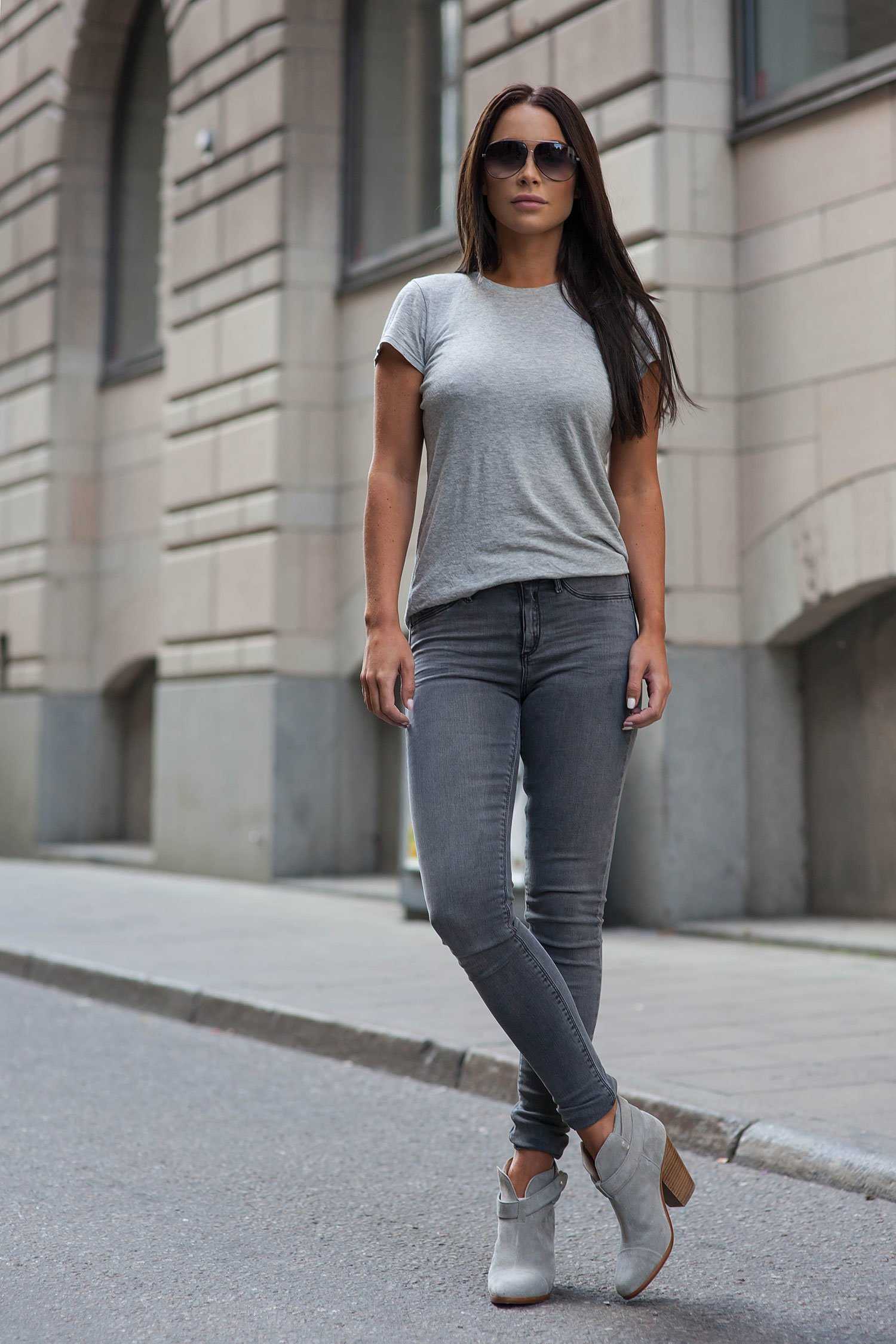 Светло-серые узкие джинсы хорошо освежают женский образ. Этот цвет считается универсальным, он подходит практически под любой предмет гардероба и сглаживает собой другие оттенки наряда. Можно создать стильный облик, надев серые джинсы и белую блузку или тунику из шифона с обувью на каблуке.