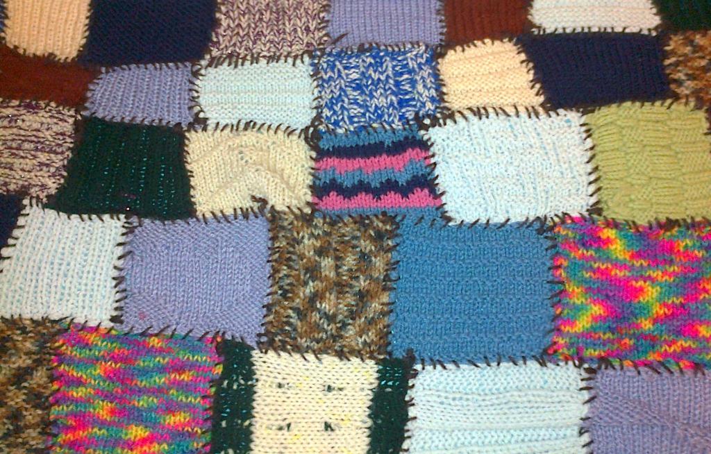 Подошли мы и к вещам покрупней. Плед из остатков пряжи? Почему бы и нет?