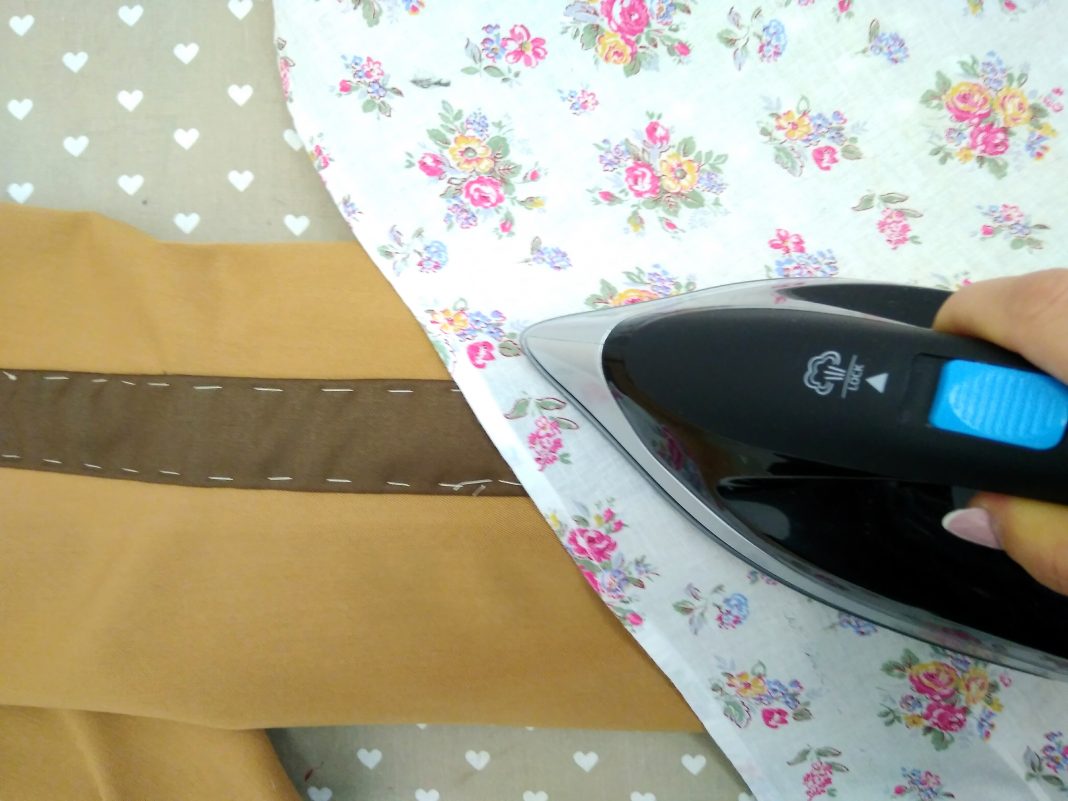 05. Направляю припуски по срезам внутрь лампаса, приметываю, проглаживаю утюгом через проутюжильник.