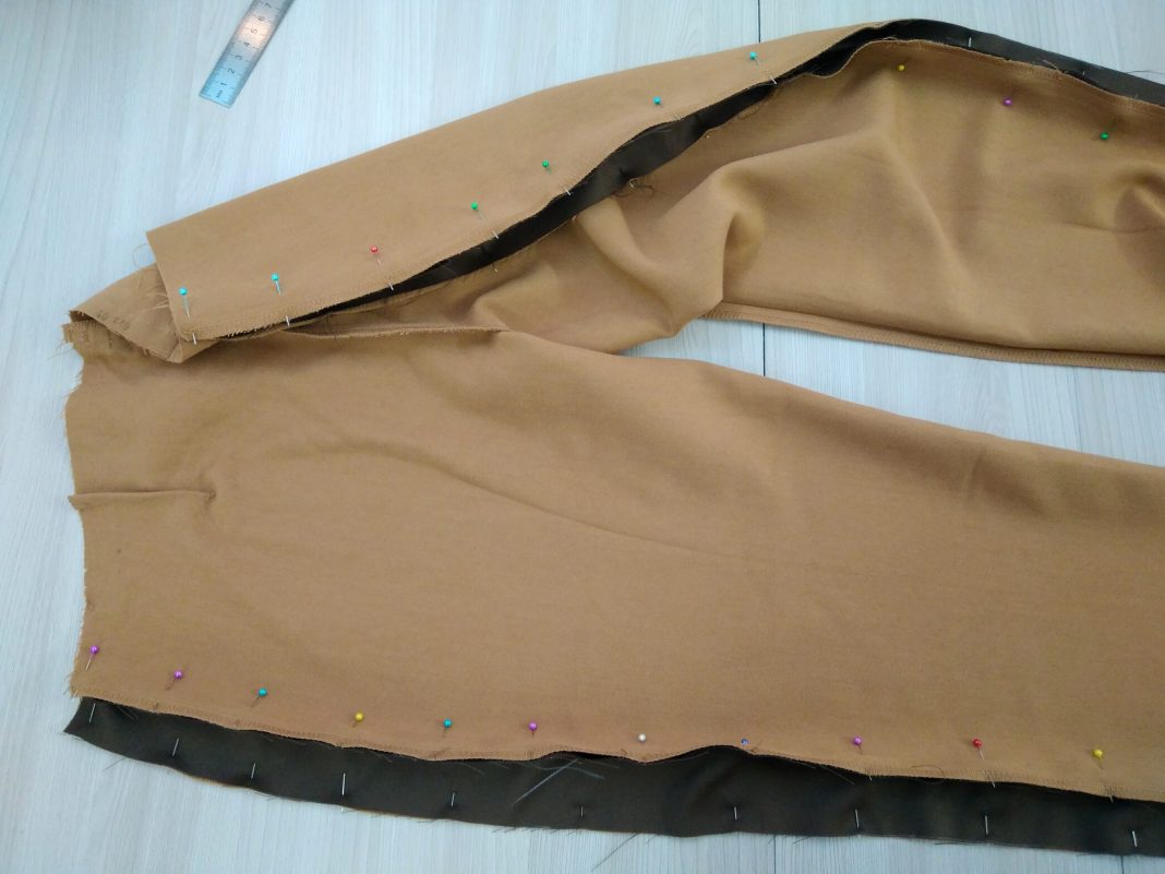03. Поочередно прикалываю с помощью портновских булавок лампасы к боковым срезам переда и спинки.