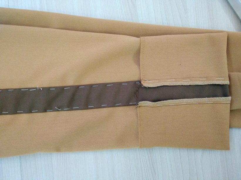 После того, как начальный конец лампасы пришит, можно переходить к следующему этапу — пришиванию остальной части лампасы к брюкам.