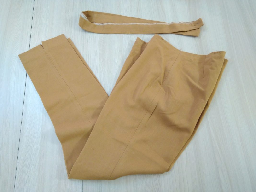 01. Беру свои брюки и с помощью распарывателя убираю пояс и полностью распускаю их по боковому и нижнему срезам.
