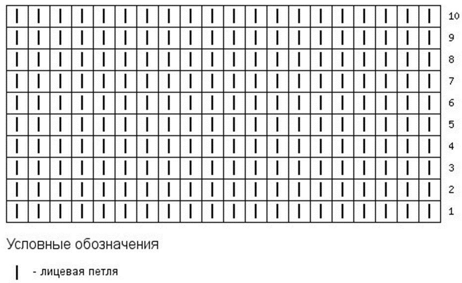 Для продолжения вязания в соответствии с описанием используют лицевую гладь. Ее схема несложная: по наружной стороне выполняют лицевые петли, а по обратной поверхности — изнаночные.