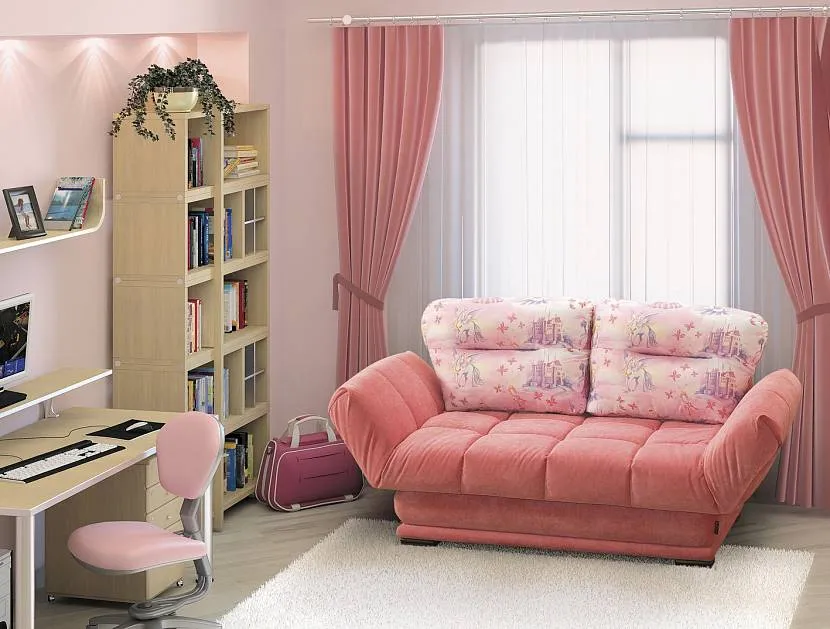 Украсить даже самую скучную комнату можно всего одним диваном с розовой обивкой. При этом желательно проследить, чтобы этот предмет не стал единственным центром притяжения внимания, для чего в разных местах размещают несколько других ярких акцентов.