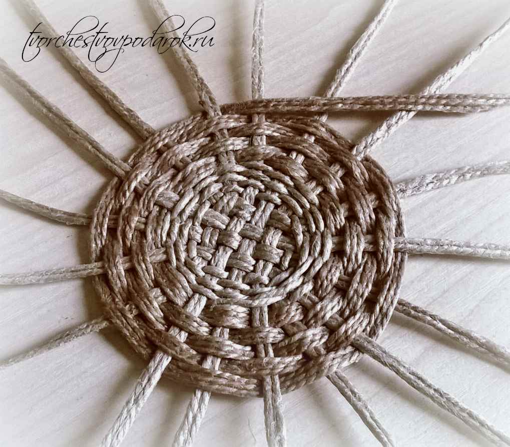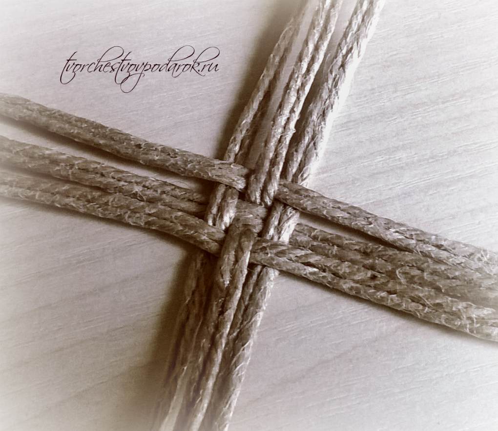 Затем приклеиваем конец нити между лентами и начинаем оплетать их по кругу в несколько рядов.