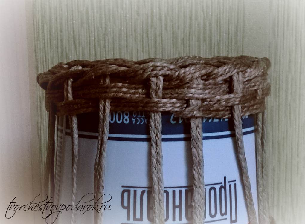 Далее оплетаем один круговой ряд из двух рабочих лент, так же как на сгибе стоек у основания дна.