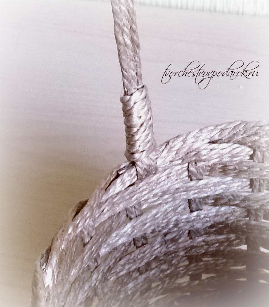 В заключение поверх ручки приклеиваем обычную классическую косичку сплетенную из джута и концы украшаем бантиками.
